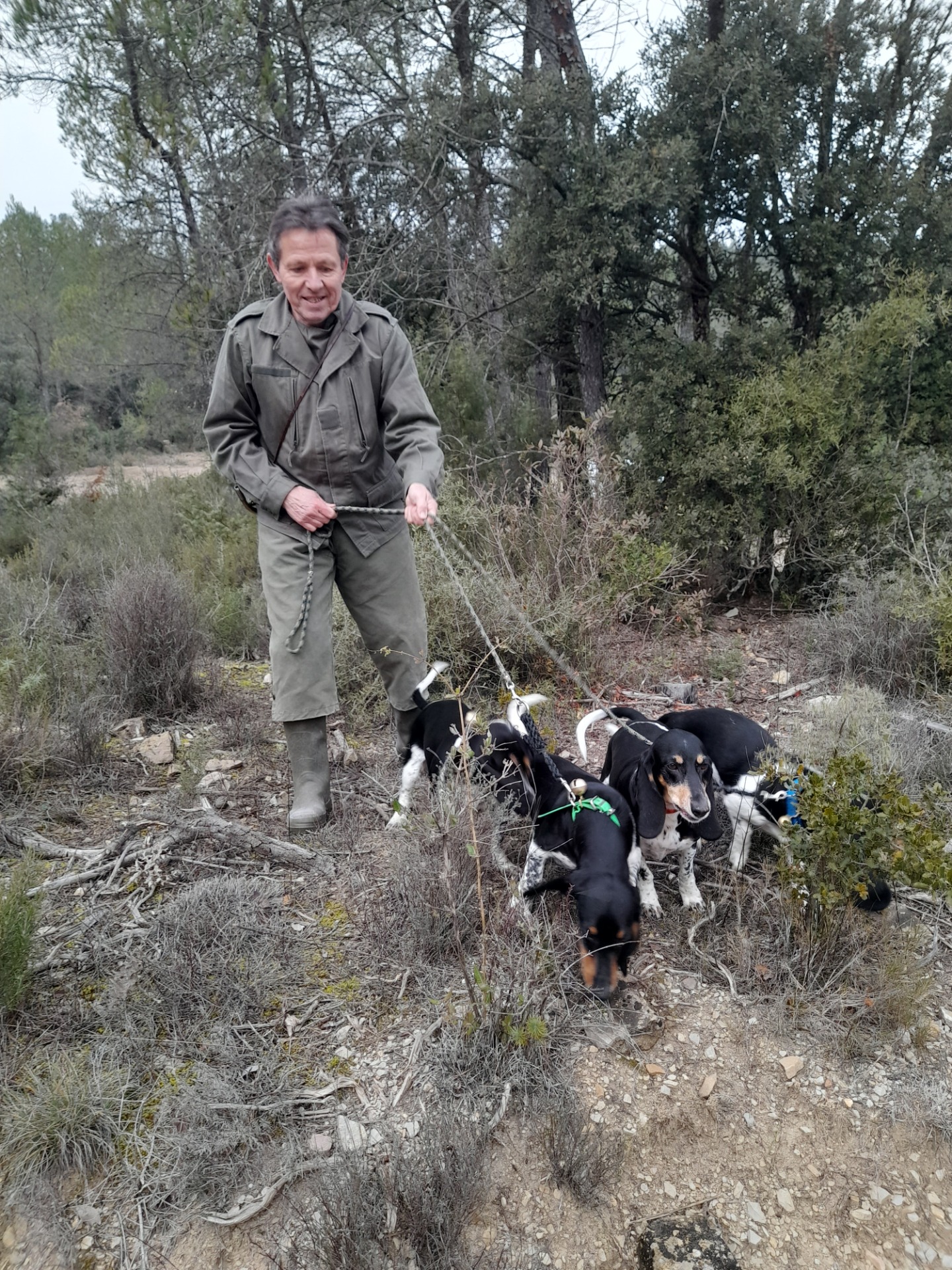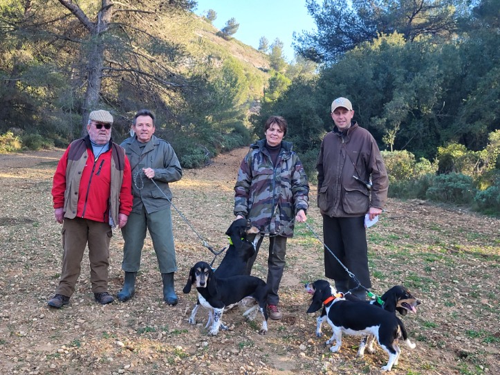 La coupe de France s'est déroulée les 11-12 janvier 2025 à Quarante (34310), à l'ouest de Béziers, dans le Minervois. Beau biotope méditerranéen : Salsepareille, chênes kermesse, cades.... Samedi matin le temps était couvert. La tramontane s'est levée, dégageant le ciel, mais refroidissant l'atmosphère. La voie était très mauvaise. Seulement trois meutes chasseront (de petitement à correctement) : 1er Bassets Bleu de Gascogne, 2ème Bassets Hounds 3ème Beagles balisé, mais le public clairsemé. Nos PCCS (Merveille, Nala, Perle et Sologne) sont passés samedi en début d'après-midi, par beau soleil avec vent. Les chiens sont haut d'état, mais actifs et requérants. Le lot est obéissant, attentif aux ordres de François. Nous avons eu quelques courts récris, vu un lapin pas poursuivi. Pas assez au goût des juges (Cabassot, Rousset, Cazals) pour attribuer un brevet. L'organisation était bonne, l'accès aux parcelles de chasse facile et bien balisé mais le public clairsemé.